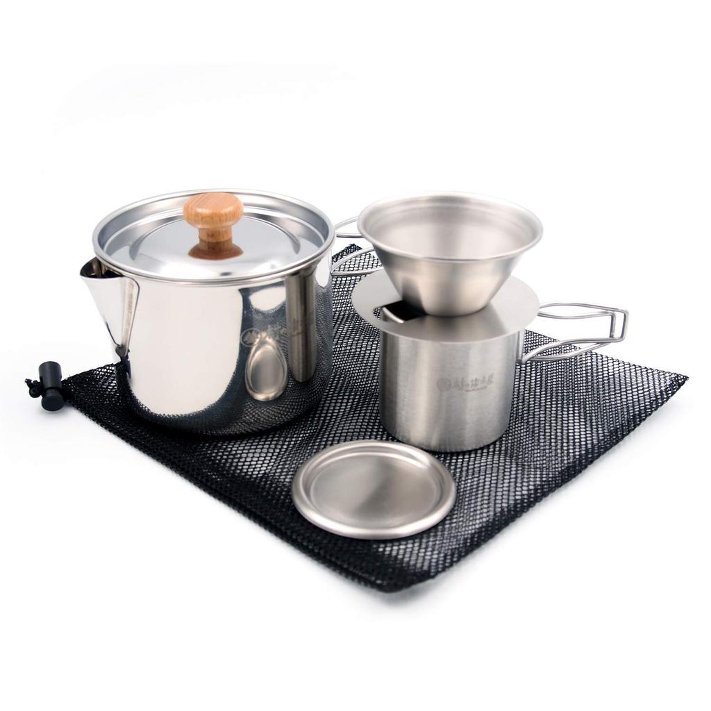 A compact dripper set that includes a kettle cooker that combines a pot and kettle, a split dripper, and a double mug.
