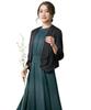 De combinatie van een strak, kraagloos jasje en een elegante kanten jurk is geschikt voor diverse ceremoniële gelegenheden.