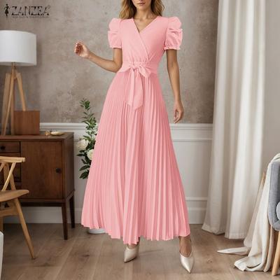 ZANZEA Summer Women Flare Sleeve Buttons Striped Casual Holiday Pleated Dress