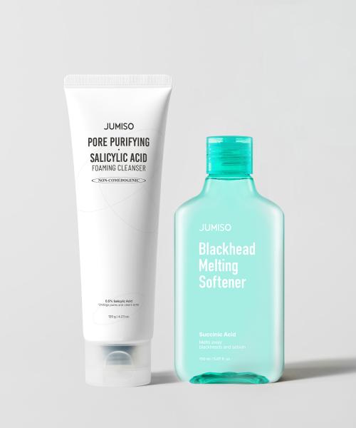 JUMISO Blackhead Melting Softener Set 150ml + Pore Purifying Salicylic Acid Cleansing Foam 120g is a cleansing product set optimized for removing sebum and blackheads. The Blackhead Melting Softener gently dissolves sebum, effectively removing impurities and blackheads from pores. Using it with dedicated cotton pads or pads enhances its effectiveness. The Pore Purifying Salicylic Acid Cleansing Foam contains salicylic acid which cleanses and clears pores of impurities and dead skin cells. Furthermore, an additional 20g of cleansing foam is provided for extended use.