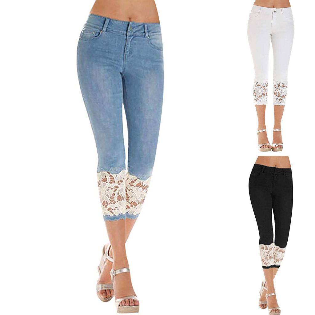 Dames skinny denim jeans Stretch slanke broek Kuitlengte Cropped kanten jeans