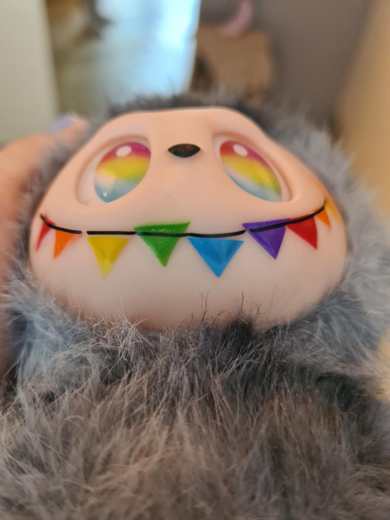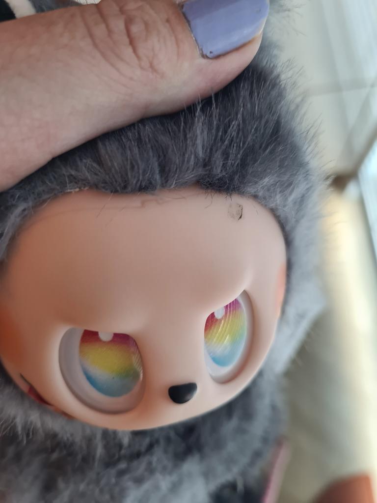 Het zijn geen echte labubu's, kijk naar hoe het is gemaakt. Verf op voorhoofd, haarlijn niet goed geplakt, neus niet goed geverfd, tanden van mond helemaal scheef, laat boven en onder lange witte draden los.