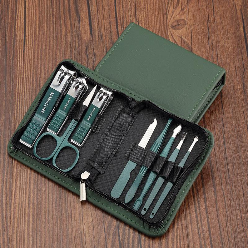 Dark Green Zipper Bag 6/9-Piece Beauty Set: Nail Clippers, Eyebrow Trimmer, Tweezers, Ear Spoon.