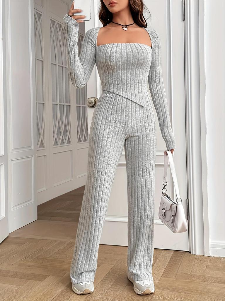 2024 Women's Solid Color Rib-Knit Lounge Set: Long-Sleeve Top & Pants