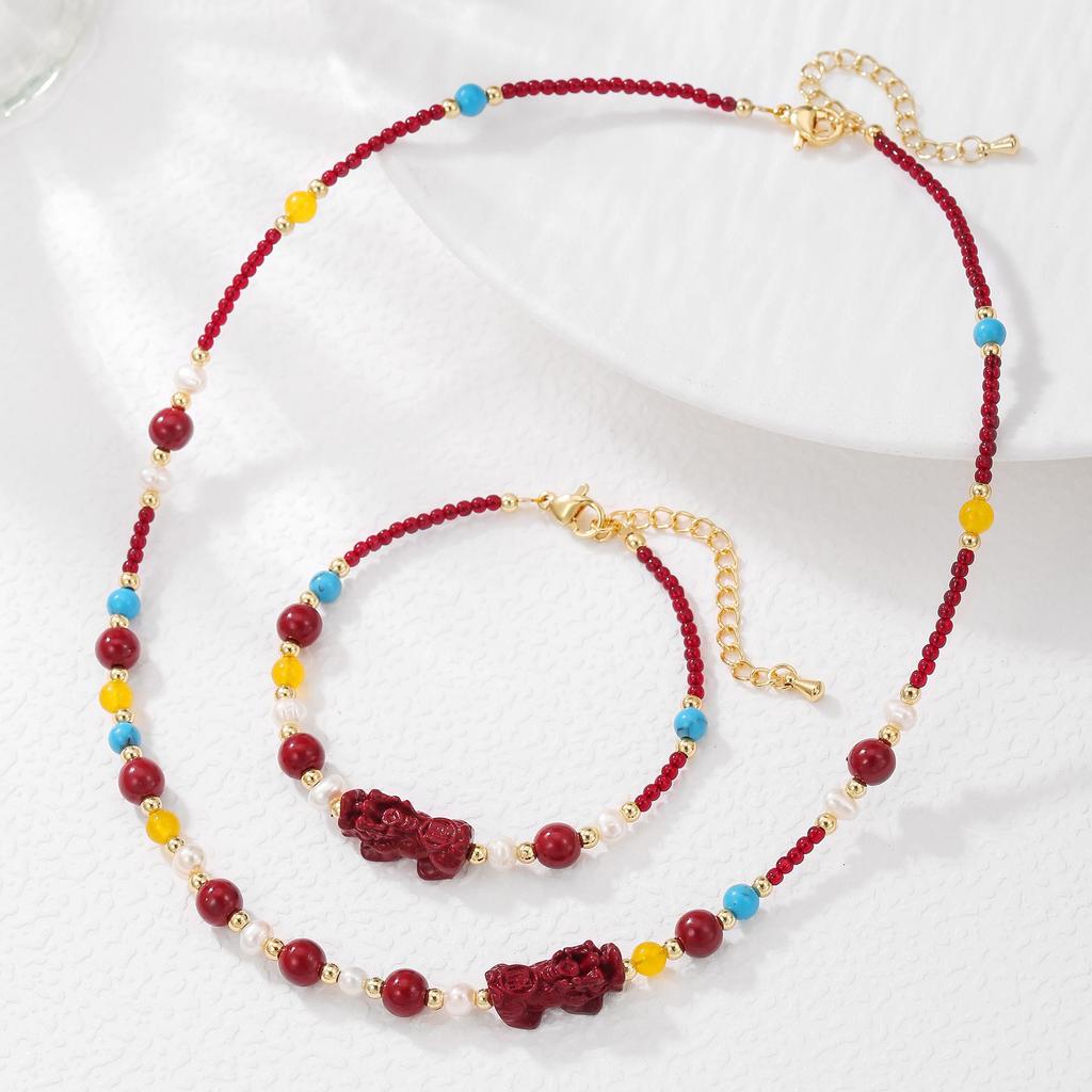 Luxe Cinnabar Pixiu & Zoetwaterparel Armband Ketting in Chinese Stijl
