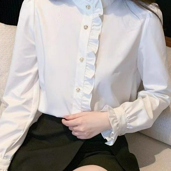 Women's White Ruffle Stand Collar Shirt - French Chic, Autumn/Spring 2025