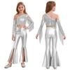 De crop top met één schouder, lange mouwen, kwastjes en glinsterende pailletten is een trendy en opvallend ontwerp dat een vleugje glamour toevoegt en ervoor zorgt dat jouw meisje opvalt.