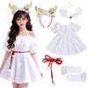 Kerst Rendier Gewei Witte Pluche Off-shoulder Jurk Set, Dames Vakantie Podiumkostuum (Jurk+Haarband+Halsversiering+Handschoenen+Riem)