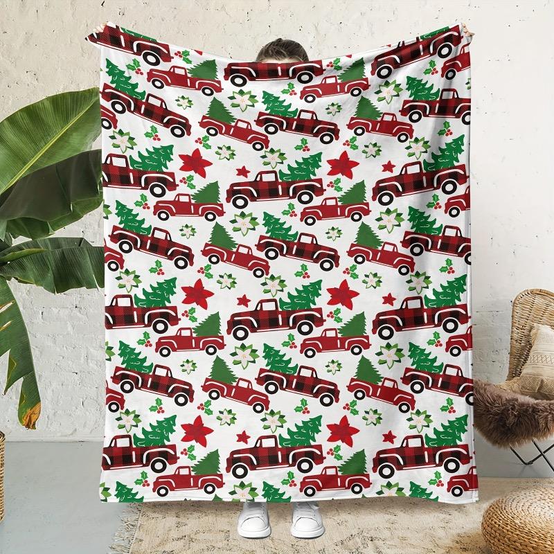 1 Christmas Pattern Blanket - Soft and Warm Flannel Cover with Red Truck Green Trees and Stars on a White Background Design