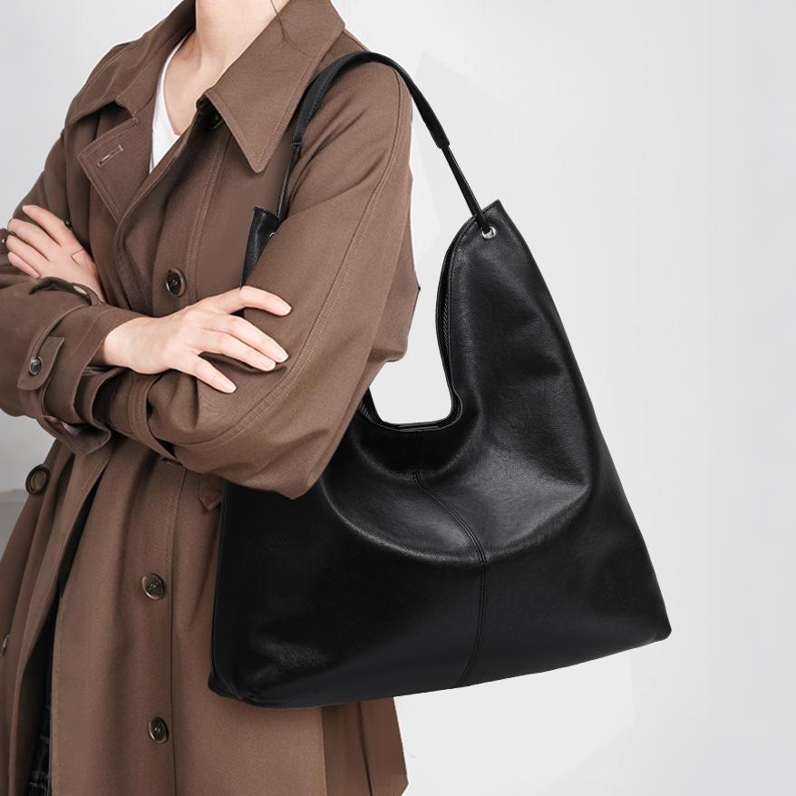 Women's Hobo Bag Genuine Leather Second Layer Soft Cowhide Handbag Black Fashion Shoulder Bag for Everyday Use