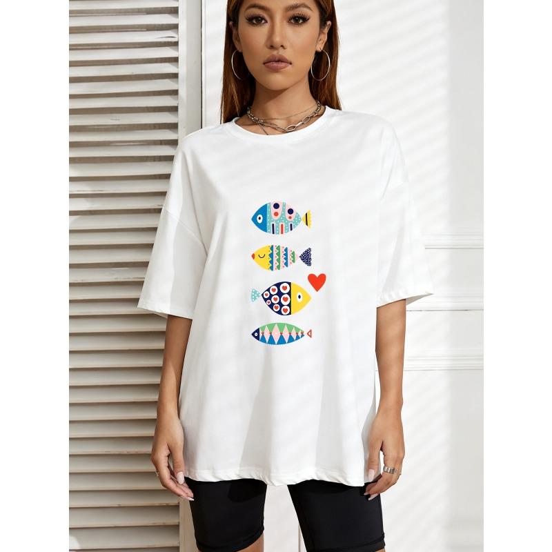 White T Shirt With Colorful Fish Pattern For Casual Wear