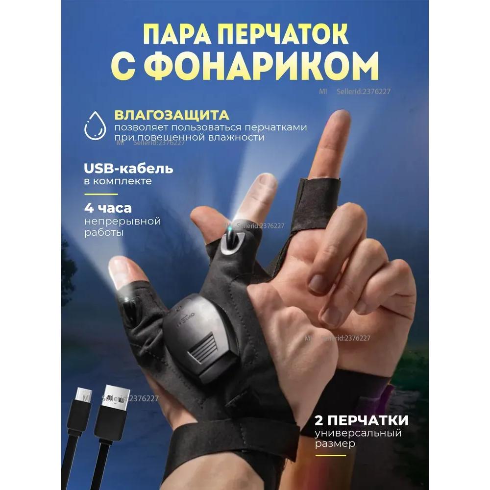 Type of flashlight: flashlight flashlight flashlight on your finger, with USB charging. Batteries. Charging via USB cable (attached). Rechargeable lithium battery 150mAh. Flashlight backlit gloves on fingers, with adjustable belt on the reel, universal size. A full set of 2 sets.
