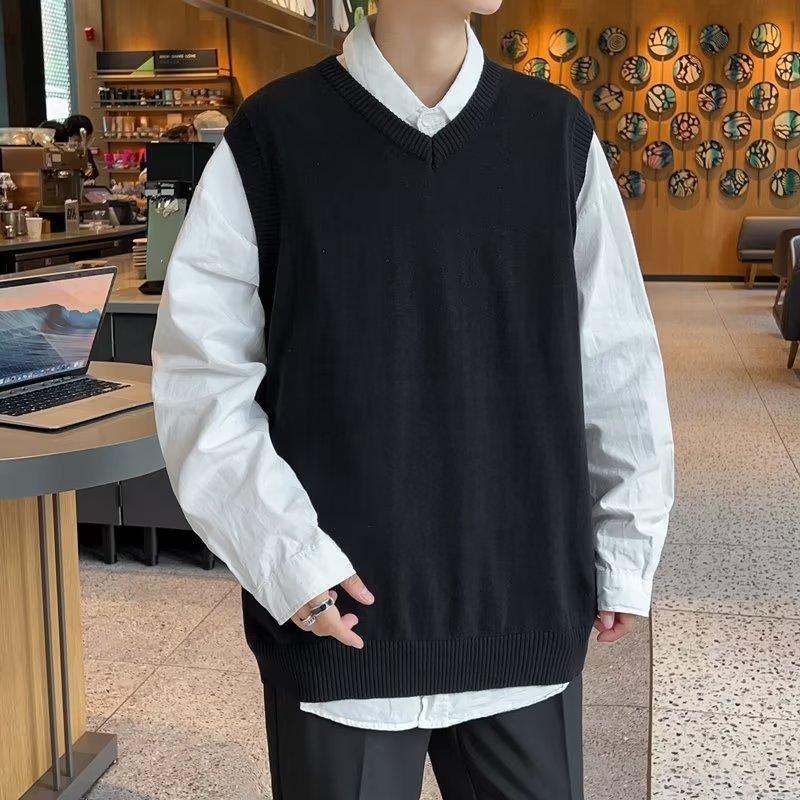 V-neck sweater men's autumn and winter Korean version trendy loose knitted sweater vest autumn ins Hong Kong style Japanese sleeveless vest
