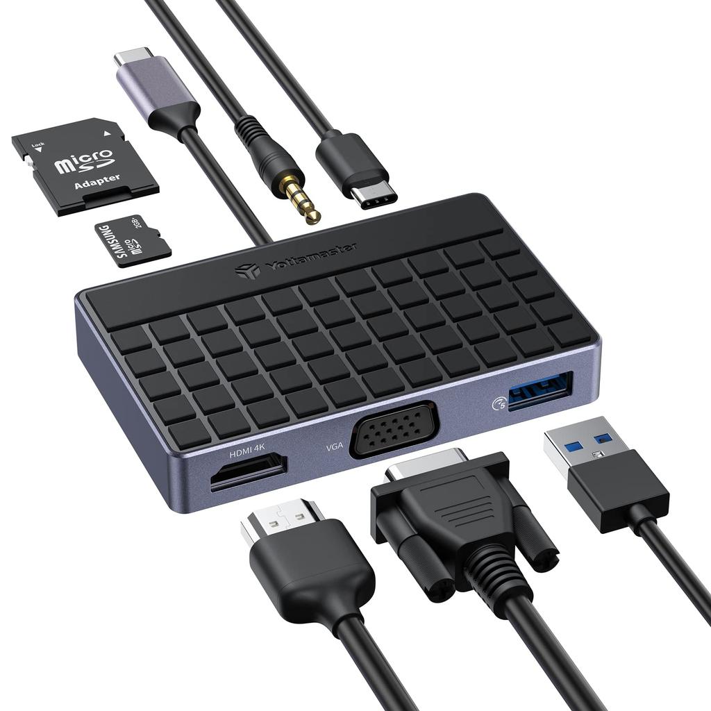[USB C Hub] This multifunctional USB C Hub features one 4K USB C-HDMI output port, one 1080P 60Hz VGA port, one 100W PD charging port, one USB 3.0 port, one 3.5mm audio port, one SD card reader, and one TF (Micro SD) card reader. Plug-and-play connectivity is easy, with no additional software or drivers required.