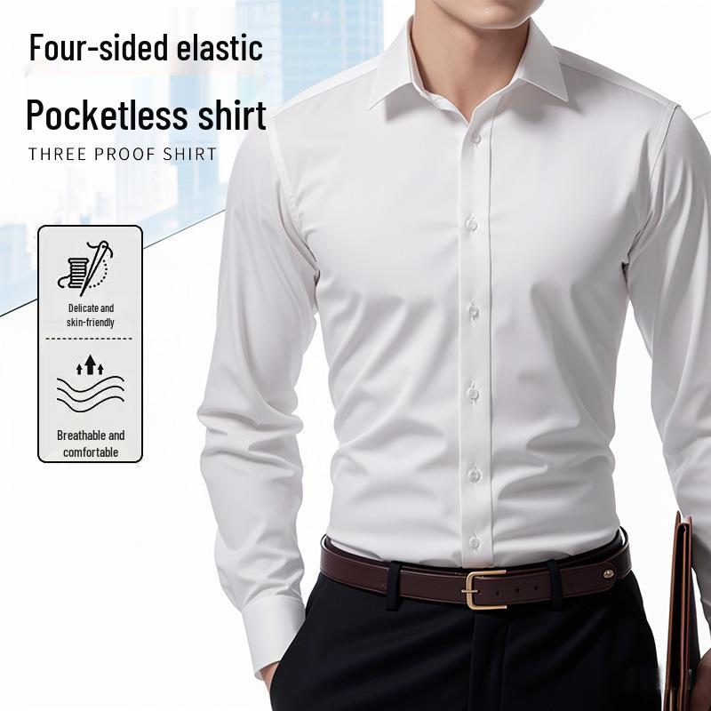 Experience a blend of comfort and style with this men's slim fit long sleeve shirt, perfect for business or commuting. Made from a four-sided stretch polyester material, this shirt offers remarkable flexibility and durability. The solid pattern exudes a classic elegance, while the square neckline adds a modern touch. Enjoy the convenience of iron-free maintenance, making it easy to keep this shirt looking crisp and professional all day long.