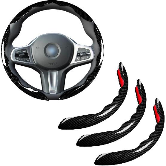 Car Steering Wheel Cover Set Bright Carbon Fiber Wrap Non-Slip 3Pcs Steering Wheel Accessories 14.5-15 Inch Universal (Black)