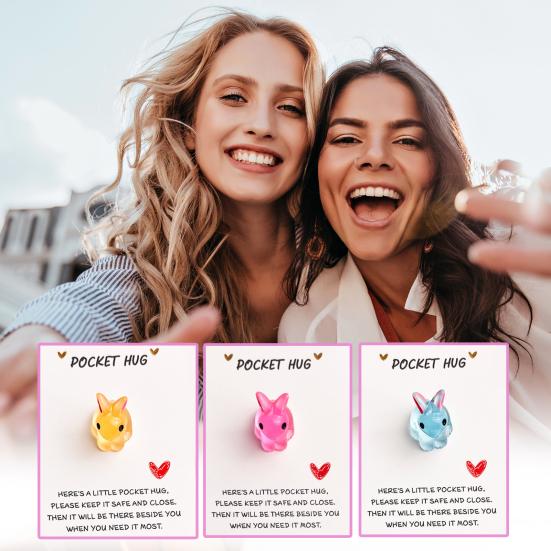 Crafted from high-quality resin and paper, this charming Easter bunny pocket hug card features a transparent mini bunny in vibrant colors like yellow, purple, green, blue, pink, and white. Each bunny's crystal-clear texture offers a delightful "palm hug" feel, making it a unique emotional keepsake. Printed with heartfelt words—"Here's a little pocket hug. Please keep it safe and close, then it will be there beside you when you need it most."—this card conveys warmth, care, and companionship.