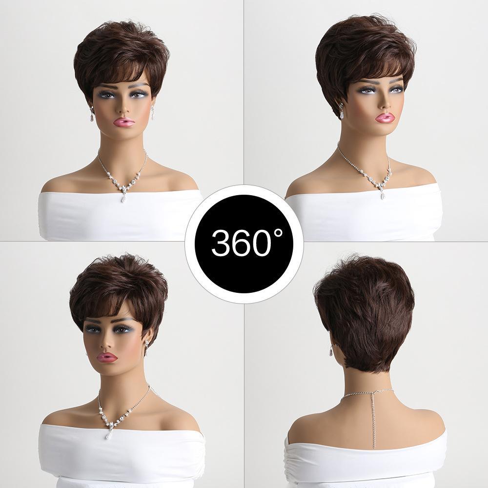 Korte Synthetische Golvende Pruiken voor Dames Natuurlijk Gelaagd Bruin Haar met Pony voor Dagelijks Feest Kostuum Hittebestendige Vezel
