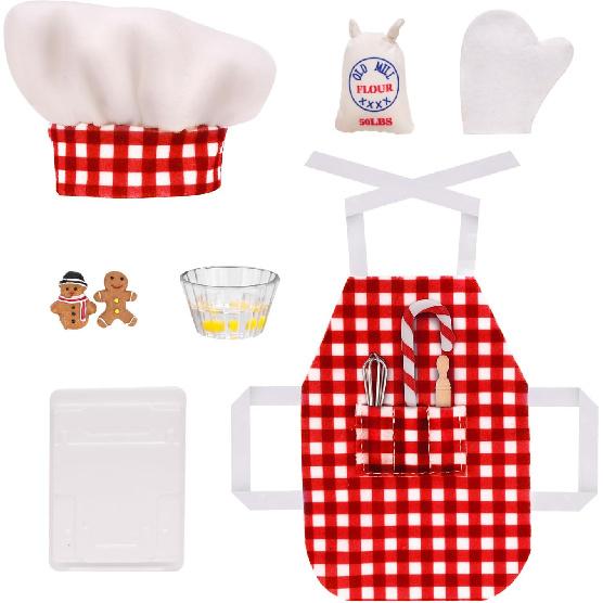 Mini Apron Clothing for Doll Christmas Elf Doll Baker Set Elf Chef Clothing Dress up Accessories Including Chef Hat,Rolling Pin,Egg Beater,Baking