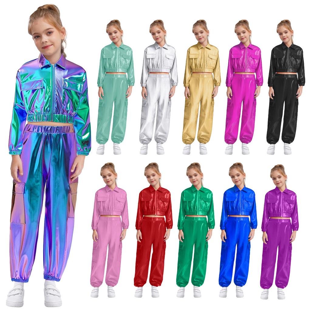 Kinderen Meisjes Jazz Hip Hop Dans Outfits Glanzend Metaalachtig Lange Mouwen Bomberjack met Zak Jogger Cargo Broek Set