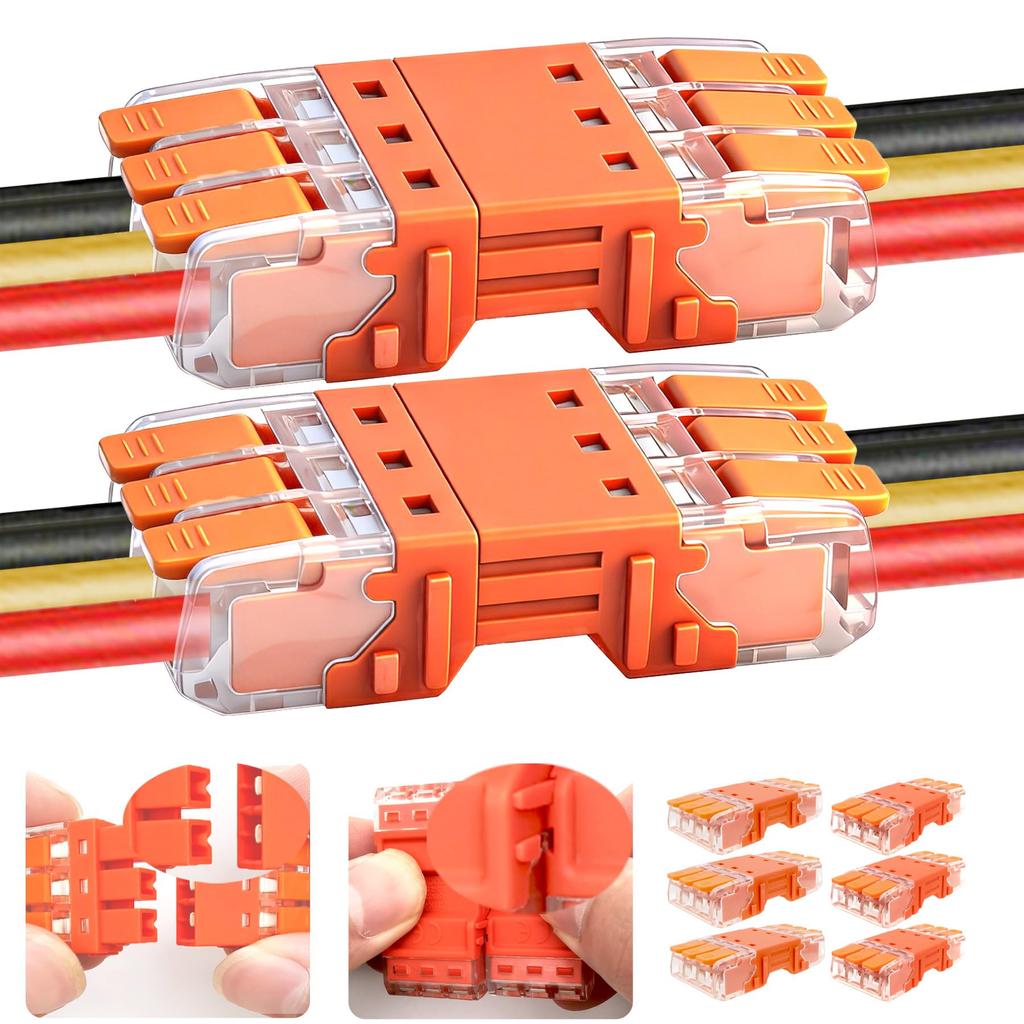 CTRICALVER 3-Way Lever Connector Set, Stackable Terminal Block, Quick Connector with Male and Female Connector, 24A, 450V, 6 Pack