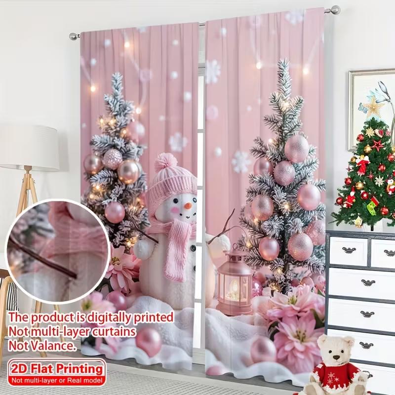 2pcs Sweet Pink Snowman Pattern Curtains Cute Design Light - Filtering Polyester Curtains for Christmas Home Windows