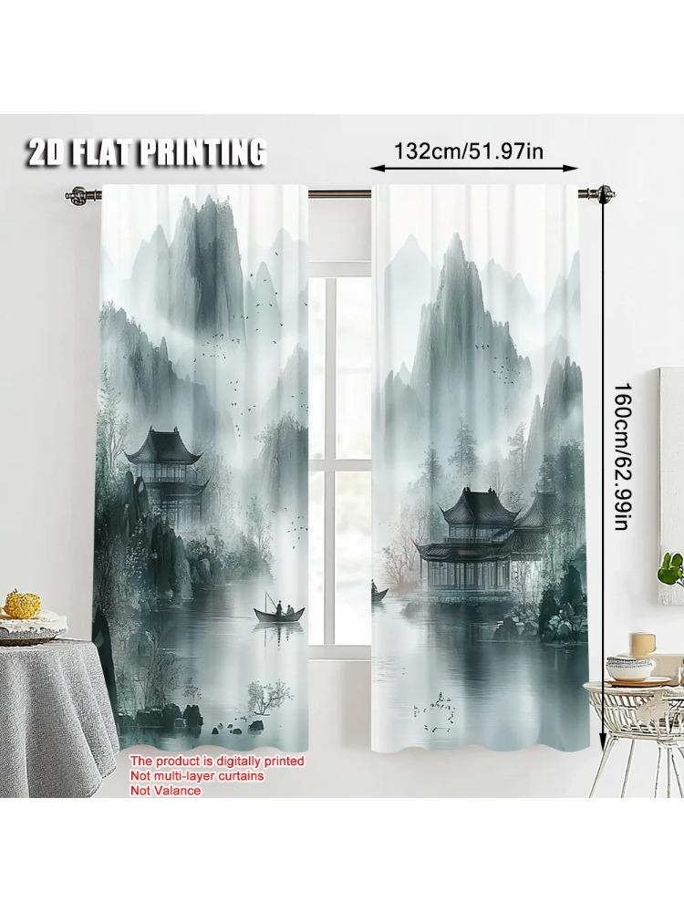 2pcs Pattern Curtains print Chinese Ink Landscape 100% Polyester (without rod) Home Decor Use for Living Room Semi-Sheer