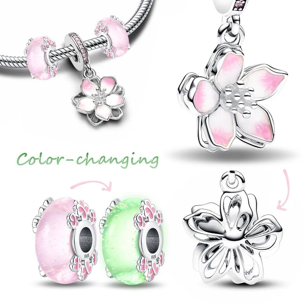 Copper Pink Flower Cherry Blossom Dangle Charms Beads Fit Pandora Charming Bracelet Bead For Women Jewelry Gift