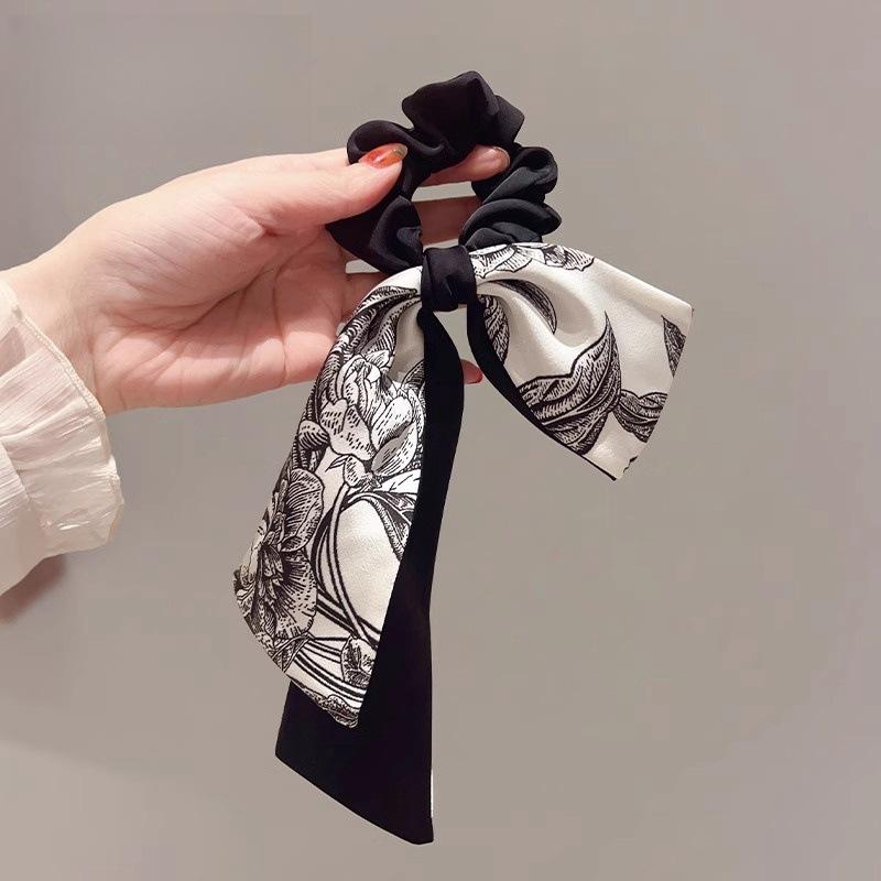 Guochao ink printing hair band French elegant unilateral bow hair rope high elastic ponytail rubber band retro hair accessories