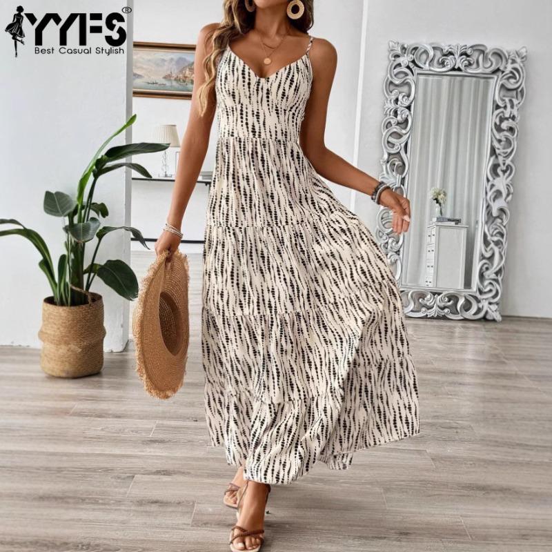 YYFS Women's Fashion Summer Spring Stripe Print Sleeveless V-Neck High Waist Casual Dresses