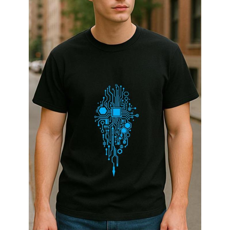 European sizes Blue Technology Circuit Diagram Men's Printed Short-sleeved Shirt, Medium Elasticity and Fashionable Style
