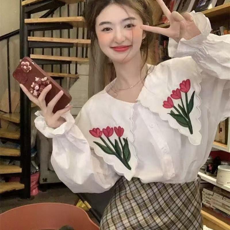 Flower Patterned Women's Shirt Embroidery Design Single Breasted Famale Loose Shirts Spring Casual Lady Long Sleeved Top