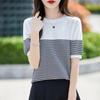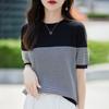 Contrast Color Striped Pure Cotton Women's T-shirt Summer Lazy Style Versatile Fitted Round Neck T-shirt Color Block Fashionable Sweater Top