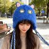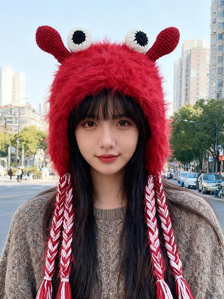 New Women'S Red Blue Plush Hat Winter Warm Cute Cartoon Knitted Earflap Beanie With Braided Tassels For Ladies Hats Casual