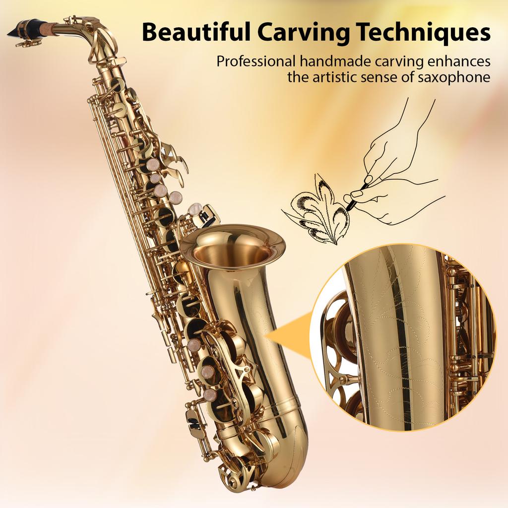 Alto Saxophone, Brass Lacquer Gold E Flat SAX 875 Key Type with SAX Accessories for All Types of Music
