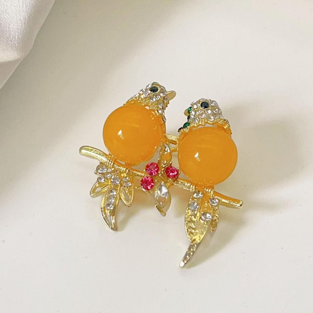 Luxe en ingetogen paar gele wielewaalbroches, hoogwaardige, exclusieve kleine corsage, broche met ontspiegelende sluiting.