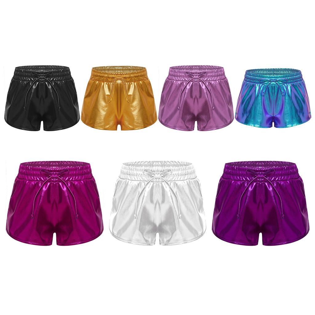 Meisjes Metallic Korte Broek Trekkoord Elastische Tailleband Glanzende Hotpants Dans Bodems Zakken Sportkorte Broek