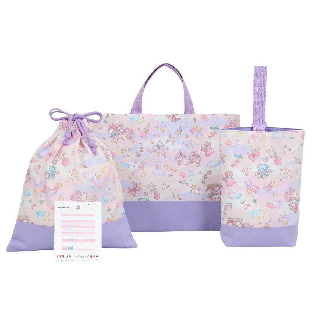 KIYOHARA Girls' Lesson Bag, Indoor Shoes Bag, Gym Clothes Bag, Name Stickers, Colorful Unicorn Design, Pink, AJMOW163-S3