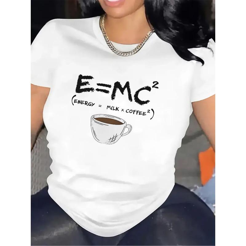 Europese maten Dames Grappig Wetenschap & Koffie Scheikunde T-shirt - E=mc² Vergelijking & Koffiemolecuul Ontwerp, Witte Opdruk op Zwart Kortmouwig Topje