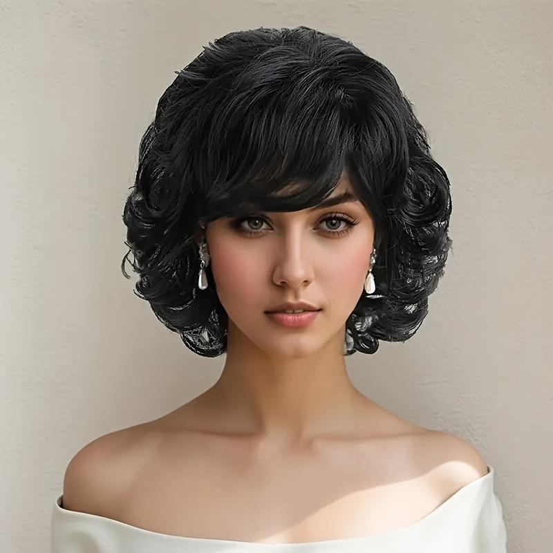 Women Synthetic Black Wigs With Bangs Short Curly Wigs for Daily Cosplay Natural Fluffy Hair Heat Resistant Fiber