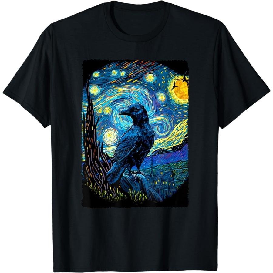 MICKAATE Raven Starry Night Style Painting, Van Gogh Crow Lover T-Shirt-Men Tshirts Graphic-Gift for Sister Birthday-Men's T-Shirts Funny Black