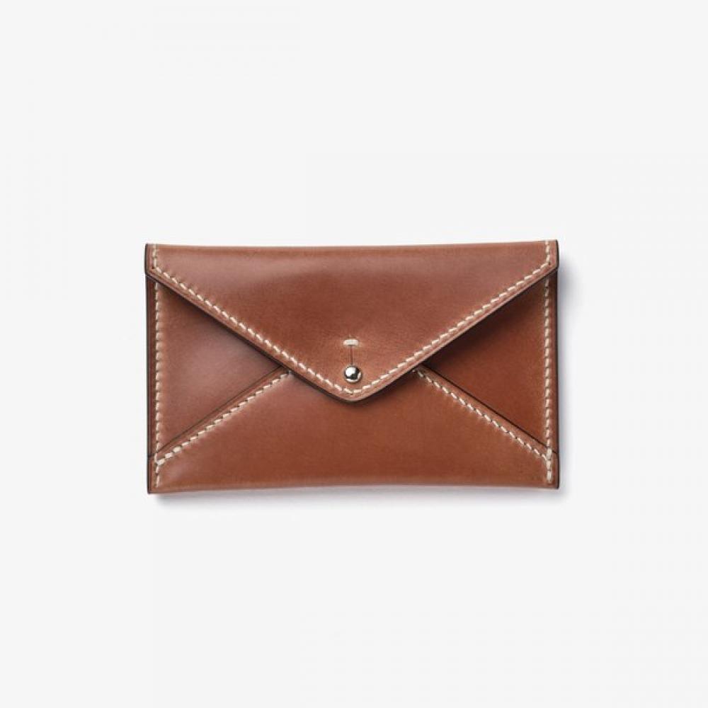 TBRM ENVELOPE Card Holder WHISKEY TBE1M80001A60 is a classic envelope-style men's card holder that boasts a slim and compact form. Made from shell cordovan leather, it features excellent durability and gloss, and is finished in an elegant whiskey color with warm brown tones. The interior includes slots for multiple cards and space for cash or receipts, making it suitable for everyday use.