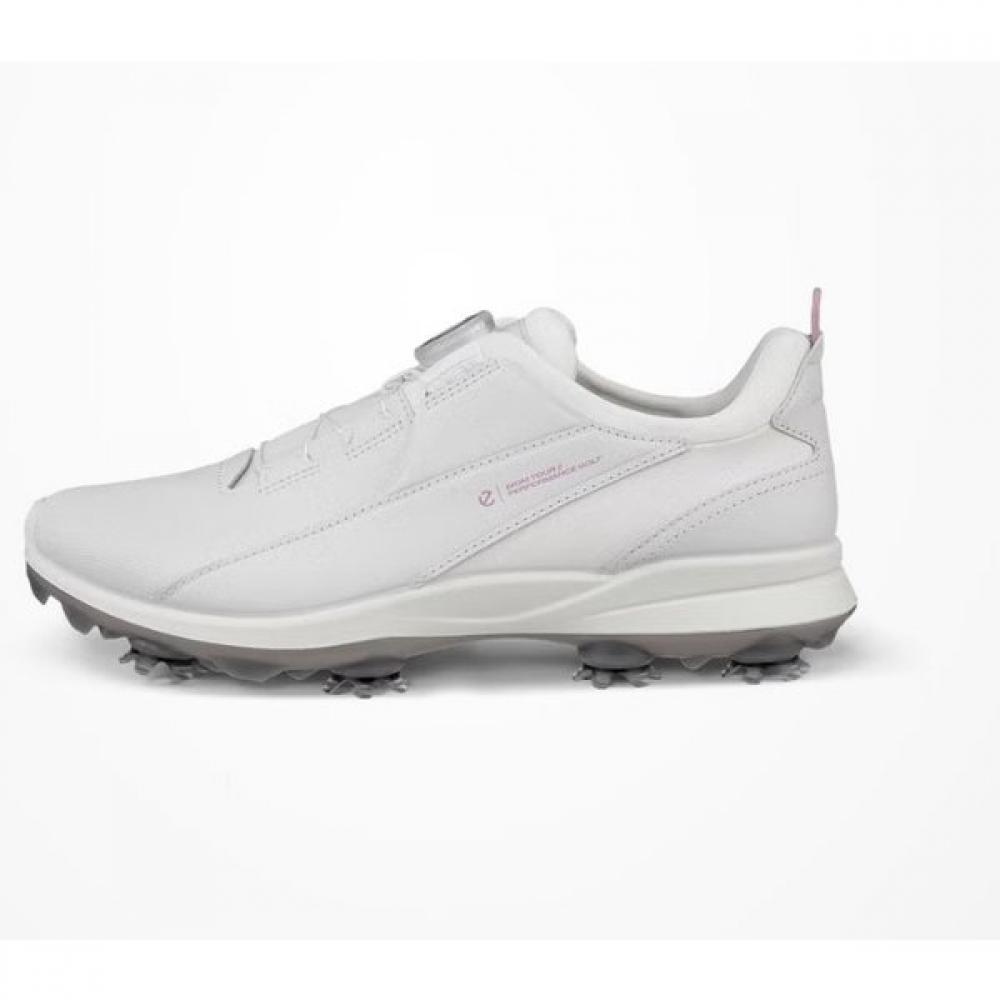 The ECCO Biom Tour Women's Spike Golf Shoe (Model: 132903-01007) features a BOA Fit System, providing a secure fit. Designed for year-round use, it maximizes performance on the golf course. It is an authentic ECCO product that combines durability with style.
