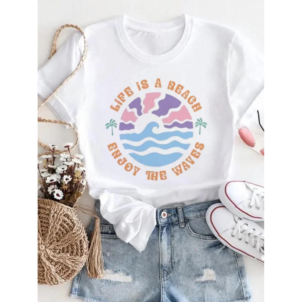 Beach Travel Top T-Shirt Short Sleeved Clothing Women's Fashion 90s Summer Trend Cute Printed Letter Pattern Plus Size T-Shirt