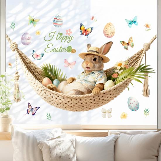 Charmant ontwerp met paasthema: Deze raamsticker, met een charmante aquarelmix van schattige konijntjes, kleurrijke eieren, vlinders en de tekst "Happy Easter", tovert elke ruimte direct om in een vrolijke paassfeer.. Het creëert een uitnodigende sfeer, perfect voor ramen, glazen deuren of feestachtergronden die de aandacht trekken en een feestelijke sfeer verspreiden.