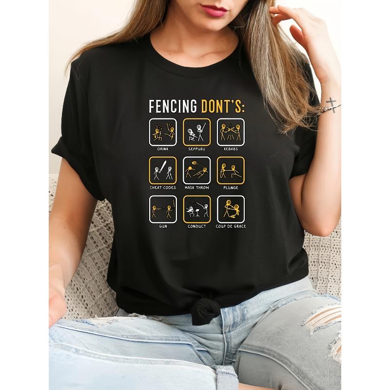 Europees Maat Dames T-shirt met Schermtaboes, Eenvoudig Slag Letterpatroon Print, Casual Ronde Hals Standaard Pasvorm T-shirt Stof
