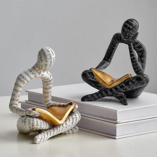 Uniek Literaire Abstracte Kenmerk: Het standbeeld toont een man die verdiept is in het lezen, met zijn lichaam ingewikkeld bedekt met gedetailleerde woorden.. Het gouden boek dat hij vasthoudt, zorgt voor een levendig contrast en creëert een boeiend middelpunt dat abstracte kunst versmelt met literaire elegantie.