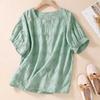 Women's Linen Floral Embroidery Blouse Loose 3/4 Sleeve Lace Trim Casual Top