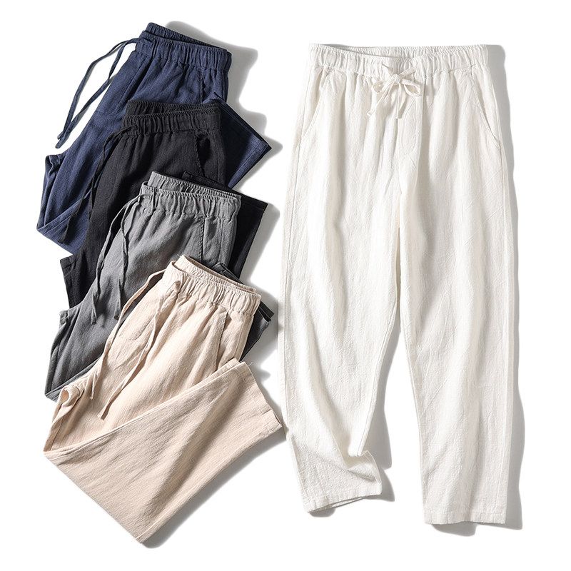 Foreign Trade Export Surplus Natural Ramie Fabric Comfortable Summer Casual Pants for Men with Elastic Waist, Thin Straight-Leg Pants