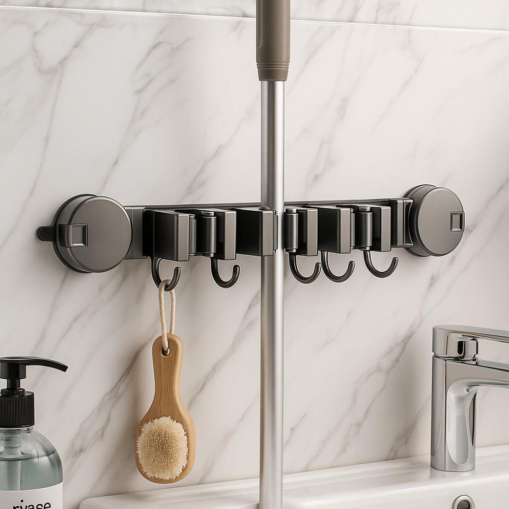 Suction Cup Installation Mop Clip Wall Mounted Adjustable Broom Storage Rack with Hook Rustproof Hook Shelf